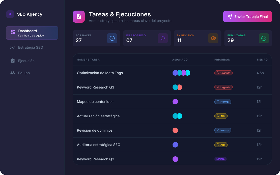 Optimiza tu flujo de trabajo con protocolos que vinculan la ejecución técnica con los objetivos de negocio de la organización. Todo bajo una metodología auditable y orientada a resultados.